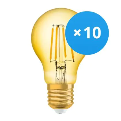 La Confezione Multipack 10x Osram Vintage 1906 LED E27 Pera Filamento Oro 4W 410lm - 824 Bianco Molto Caldo | Sostitutiva 40W è la perfetta sostituzione per la tua lampada convenzionale 35W con attacco E27 grazie alla sua tecnologia LED. Passare a LED ti offrirà tanti vantaggi!