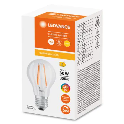 Descrizione Ledvance Classic LED E27 Pera Filamento Chiara 7.2W 806lm - 927 Bianco Molto Caldo | Miglior resa cromatica - Dimmerabile - Sostitua 60W