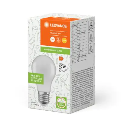 Descrizione Ledvance Classic LED E27 Pera Ghiaccio 4.9W 470lm - 827 Bianco Molto Caldo | Sostitutiva 40W - Riciclato