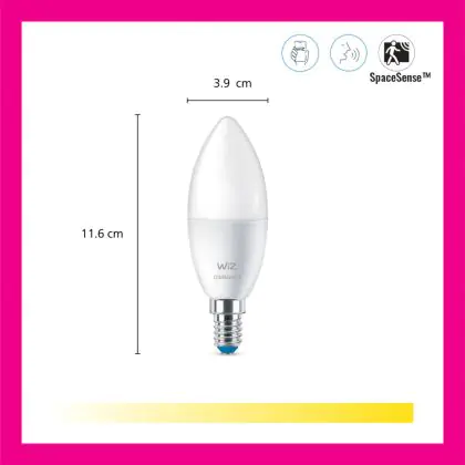 Risparmierai fino al 90% sui costi energetici e di mantenimento, grazie al basso consumo di energia assorbita dai 5W e ad una vita media utile di 15000 ore. A confronto: le lampade ad incandescenza tradizionali durano solamente 1000 ore. L’installazione delle lampadine LED è molto semplice: basta svitare le vecchia lampadina E14 a freddo ed avvitare la nuova lampada WiZ Candela. Questo prodotto possiede la garanzia di qualità offerta da WiZ e prezzi accessibili che partono da . Potrai utilizzare queste lampade usufruendo della Garanzia Totale Lampadadiretta.it di 2 anni.